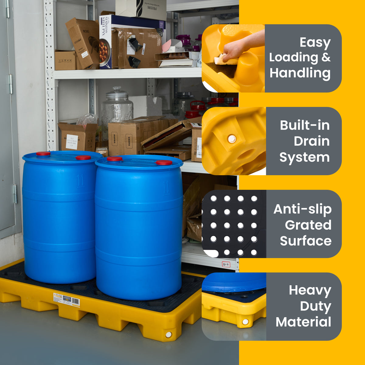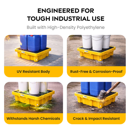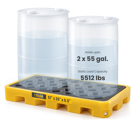 2-Drum Spill Containment Workstation – 51" x 26" x 6.5" Low-Profile Drum Work Deck, HDPE, Yellow