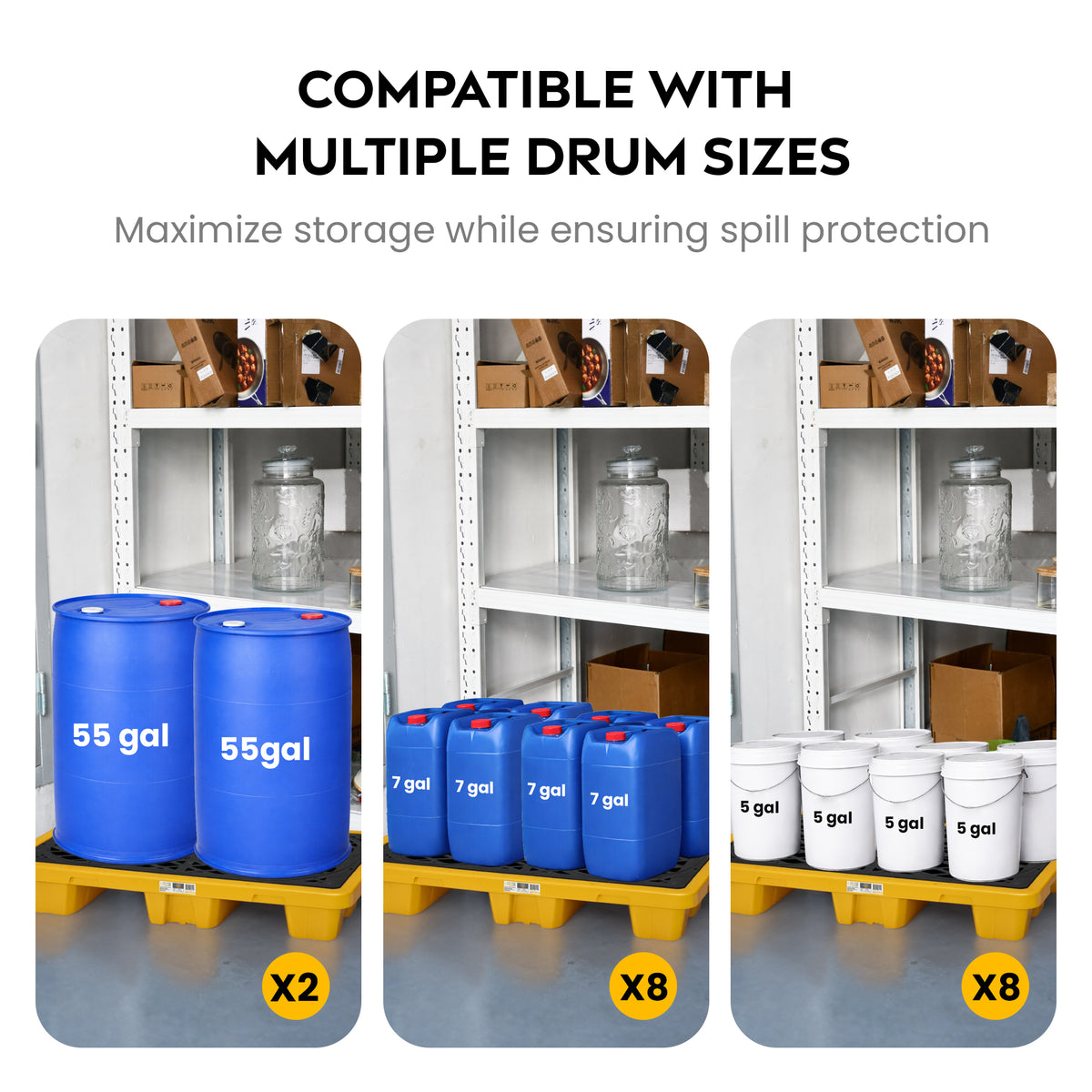 • Holds (2) 55 gal. Poly or Steel Drums